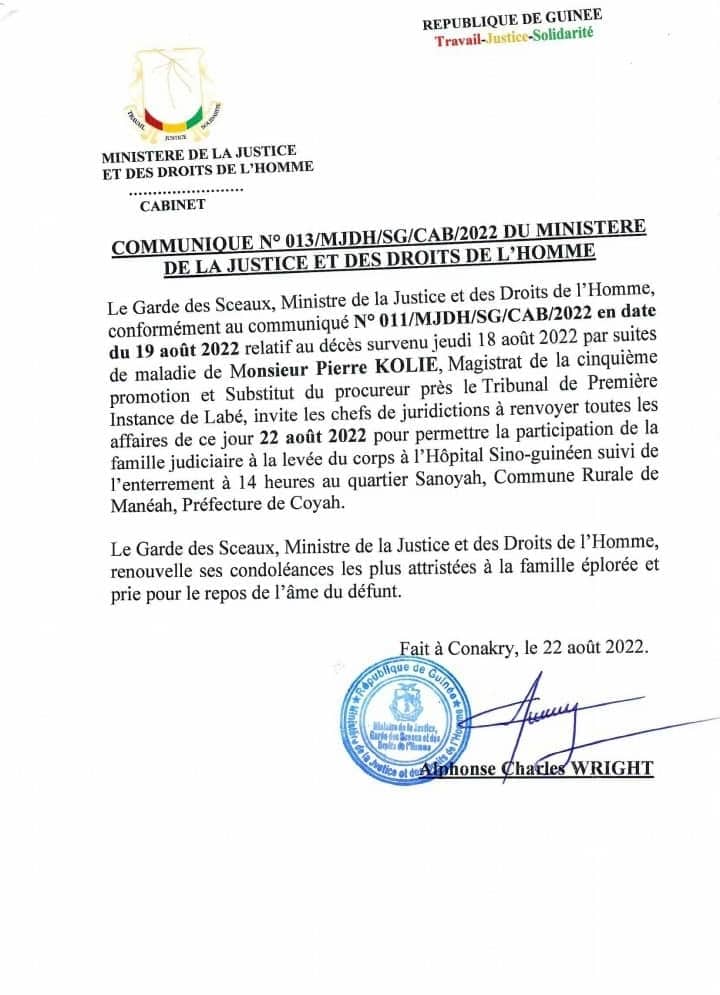 Dans un communiqué, le ministre de la Justice, des droits de l’homme, Garde des sceaux, Alphonse Charles Wright a invité les chefs des différentes juridictions à renvoyer les affaires de ce 22 août 2022 pour permettre aux acteurs du système judiciaire de participer aux funérailles du magistrat Pierre Kolié.