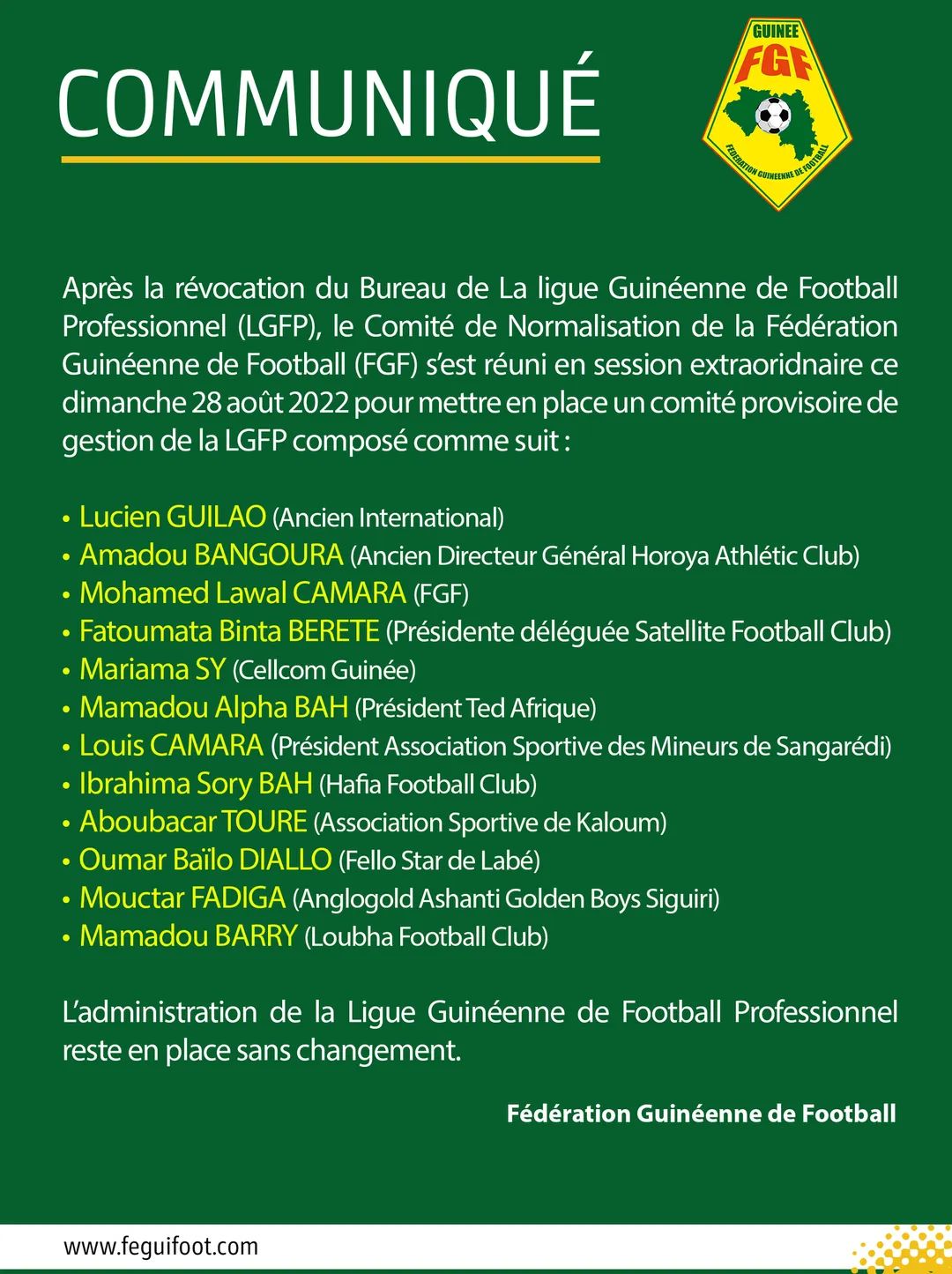 Après la révocation mercredi dernier de l’équipe dirigée par Mathurin Bangoura, le Comité de Noemalisation (CoNor) de la Fédération guinéenne de football (FGF) a mis en place lundi un comité provisoire de gestion de la Ligue Guinéenne de Football Professionnel (LGFP). Ce comité compte 12 membres dont l’ancien ministre et ancien footballeur Lucien GUILAO.