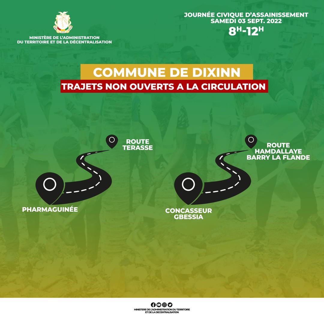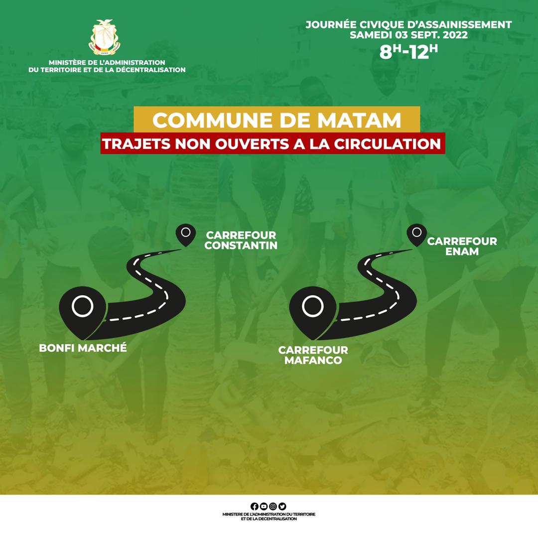 Le Ministre de l’Administration du Territoire et de la Decentralisation informe que la circulation ne sera pas bloquée, cependant les axes routiers ci-dessous ne seront pas ouverts pour cause de grands travaux :