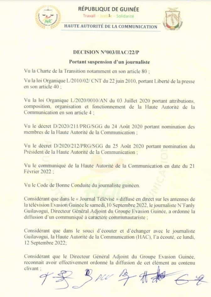 L’article Média : la HAC suspend pour dix jours un journaliste de la télé Évasion Guinée est apparu en premier sur Mediaguinee.org.