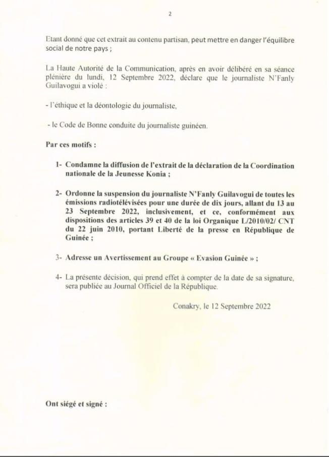 La Haute Autorité de la Communication (HAC) -dirigée par Boubacar Yacine Diallo- a suspendu lundi de toutes les émissions radiotélévisées le journaliste de la télévision Évasion Guinée N’Fanly Guilavogui pour diffusion d’un « communiqué à caractère communautariste ». Décision…
