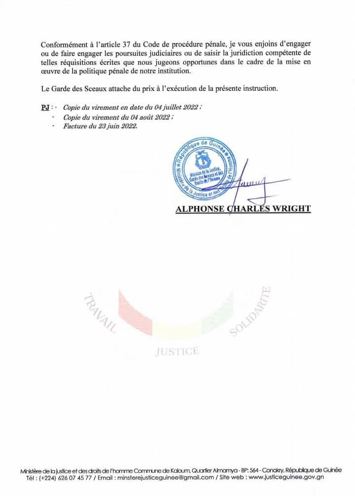 Le ministre de la Justice et des Droits de l’Homme Alphone Charles Wright a ordonné mercredi de poursuivre le directeur général de la Caisse nationale de sécurité sociale (CNSS) Bakary Sylla et Assimiou Sall, ancien agent comptable pour détournements présumés de deniers publics et complicité. Le montant concerné s’élève à 67 mille 800 euros…