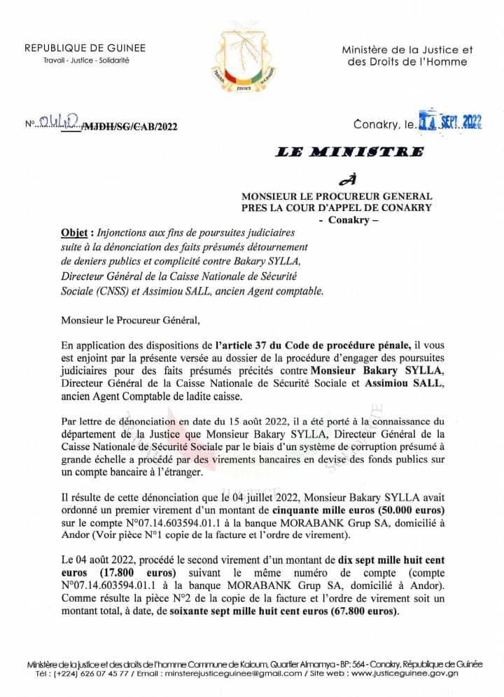 Dans une lettre, le ministre de la Justice, Alphonse Charles Wright, a ordonné au procureur près la cour d’appel de poursuivre pour des faits présumés de détournement de deniers publics et complicité, le directeur général de la Caisse nationale de sécurité sociale, Bakary Sylla et Assimiou Sall, ancien agent comptable de l’institution.