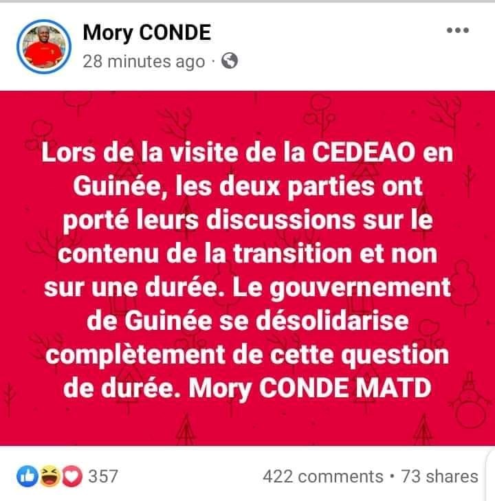 Le colonel n’a pas été juste en affirmant que « La première sortie n’a pas fait l’objet de réaction parce qu’il avait été estimé qu’il fallait de la hauteur ». La première sortie est une allusion faite aux propos du Président Embalo en conférence de presse face à Emmanuel Macron. Il indiquait que lors de sa visite à Conakry, il a trouvé un accord de 24 mois de transition avec les militaires. Contrairement à ce qu’affirme le colonel Amara CAMARA, le ministre de l’Administration du Territoire et de la Décentralisation, Mory Condé, avait fait un post Facebook et un Tweet pour se désolidariser des propos du Président Embalo au nom du gouvernement guinéen. Bien évidemment, les deux publications seront supprimées par le ministre. En voici une capture d’écran largement relayée sur les réseaux sociaux :