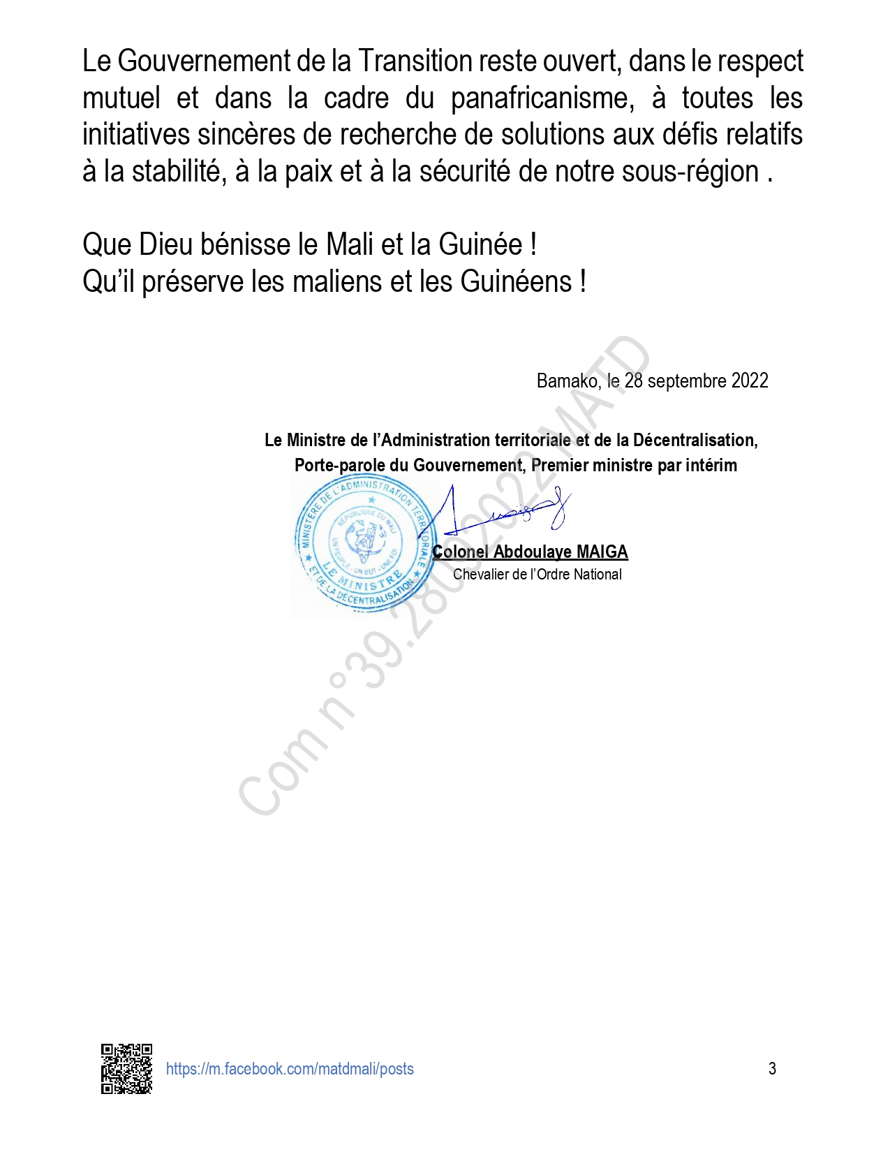Les sanctions prises contre la Guinée par la Cedeao lors de son sommet extraordinaire en marge de l’Assemblée générale de l’ONU ne passent pas au Mali. Le gouvernement malien l’a annoncé mercredi dans un communiqué signé du Premier ministre par intérim colonel Abdoulaye Maiga. Le Mali non seulement se désolidarise des sanctions prises qu’il qualifie d’illégales, inhumaines et illégitimes mais compte adopter si nécessaire des mesures pour assister la Guinée. Communiqué…