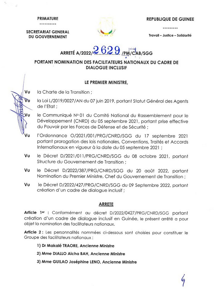 Après la mise en place d’un groupe de facilitateurs dans un premier arrêté, le premier ministre de la transition a dans un second arrêté désigné les trois facilitateurs du cadre de dialogue inclusif.