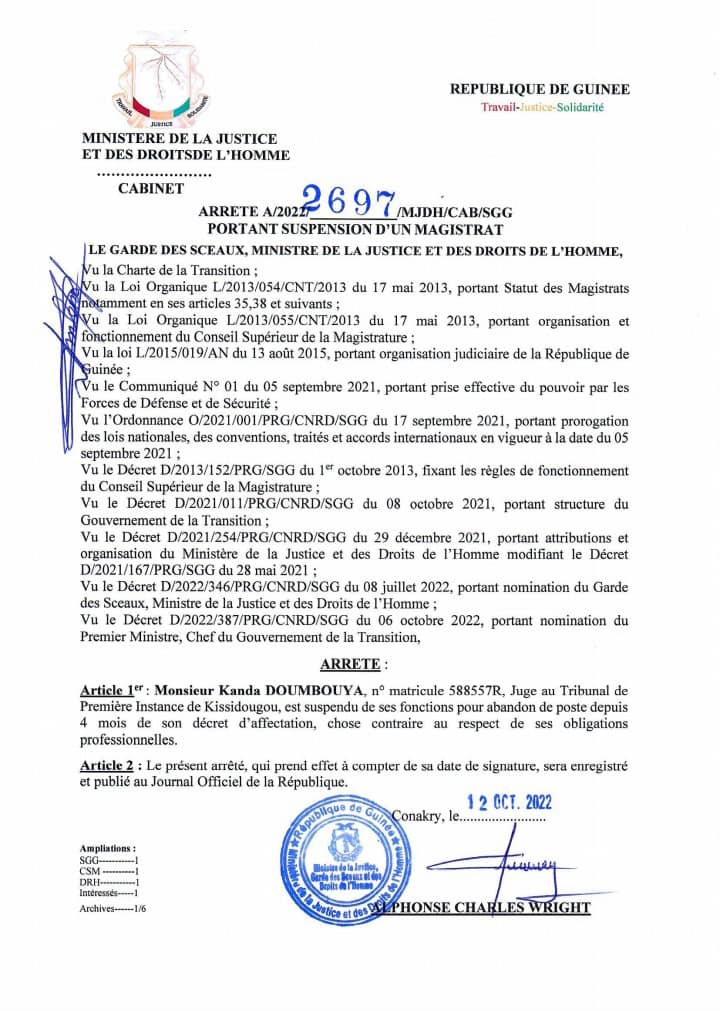 Le ministre de la Justice et des Droits de l’homme Alphonse Charles Wright a suspendu mardi le juge au tribunal de prémière instance de Kissidougou Kandas Doumbouya pour « abandon de poste »