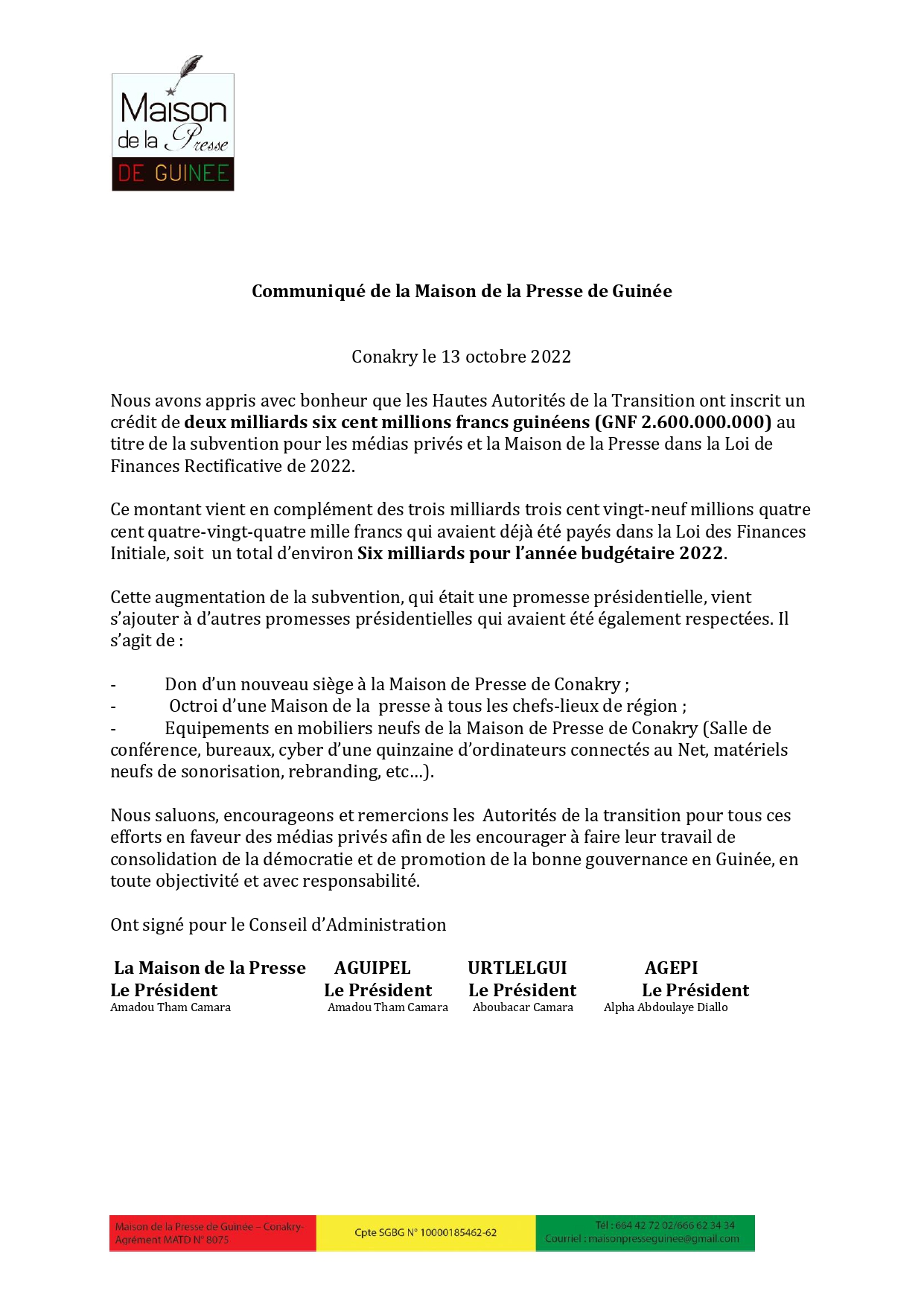 Promesse tenue. Les autorités de la transition, à leur tête le colonel Mamadi Doumbouya, ont revu à la hausse la subvention aux médias privés et à la Maison de la presse. Plus de 9 mois après la rencontre du 7 janvier dernier au palais Mohammed V entre le président de la transition et les journalistes. C’est le conseil d’Administration de la Maison de la presse de Guinée qui l’a annoncé jeudi dans un communiqué.