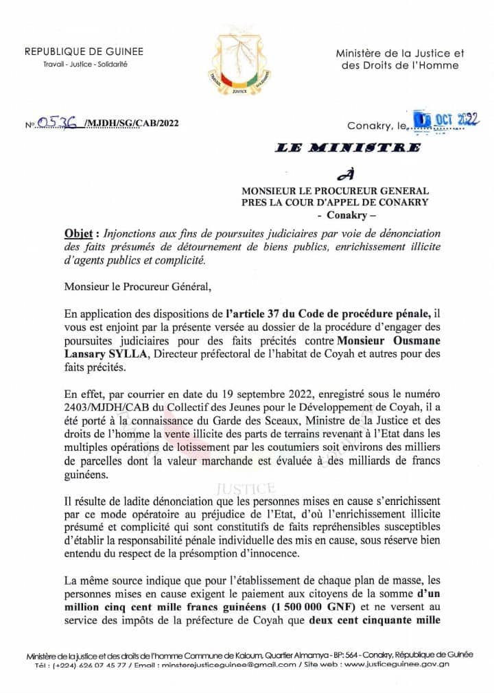 Pour des faits présumés, de détournements de biens publics, enrichissement d’agents publics et complicité, le ministre de la justice et des droits de l’homme, Alphonse Charles Wright, a ordonné au procureur de la cour d’appel de Conakry, de poursuivre Ousmane Lansary Sylla, directeur préfectoral de l’habitat de Coyah dénoncé par un collectif de jeunes. Lire ci-dessous sa lettre.