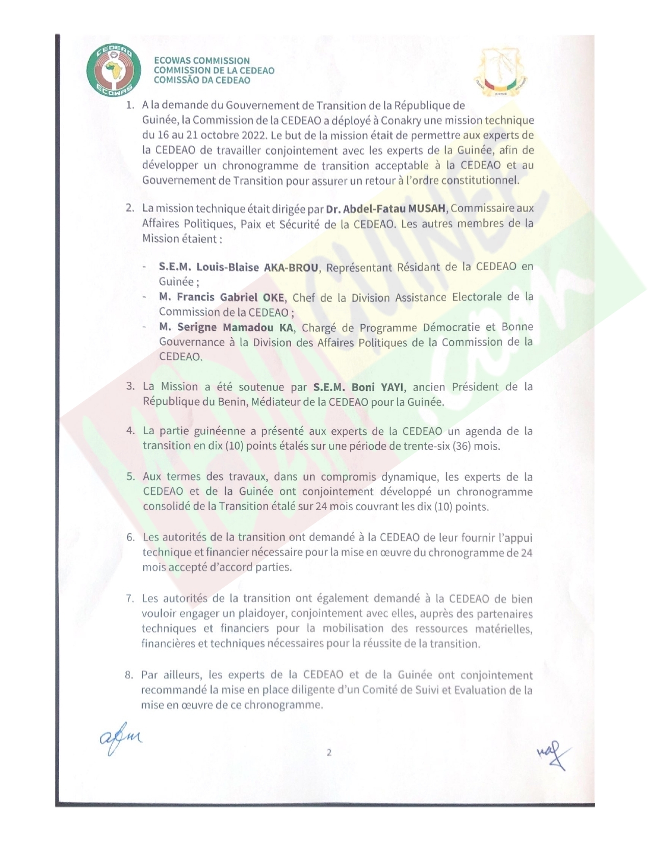 Au cœur de l’information, Mediaguinee vous livre en exclusivité le contenu détaillé du rapport de la Mission technique de la Cedeao sur la transition en Guinée…