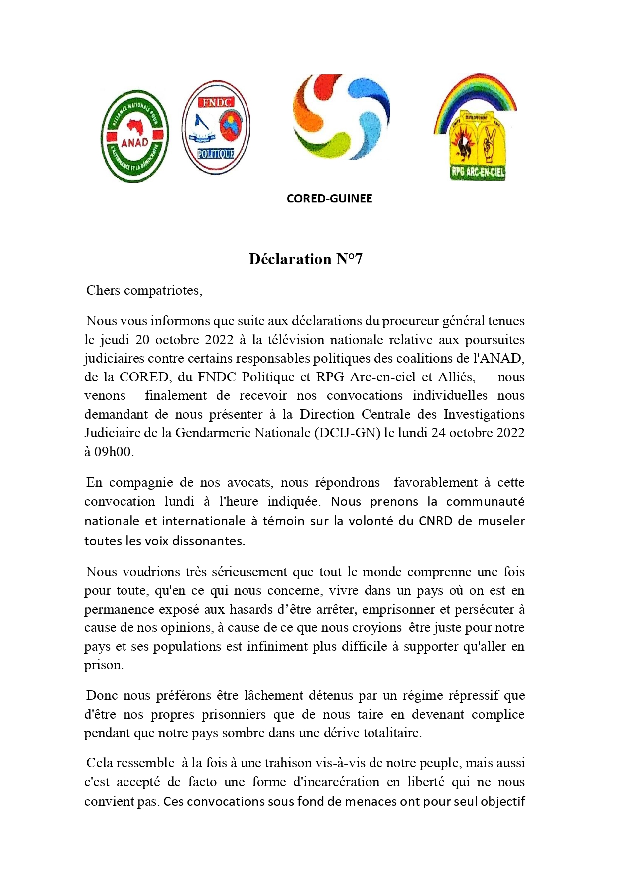 Des responsables politiques guinéens, au nombre de huit, ont cosigné une déclaration dans laquelle ils annoncent qu’ils répondront ce lundi à la convocation de la direction centrale des investigations judiciaires de la gendarmerie (DCIJ-GN) en compagnie de leurs avocats. Car, décident-ils, « nous préférons être lâchement détenus par un régime répressif que d’être nos propres prisonniers ». Déclaration