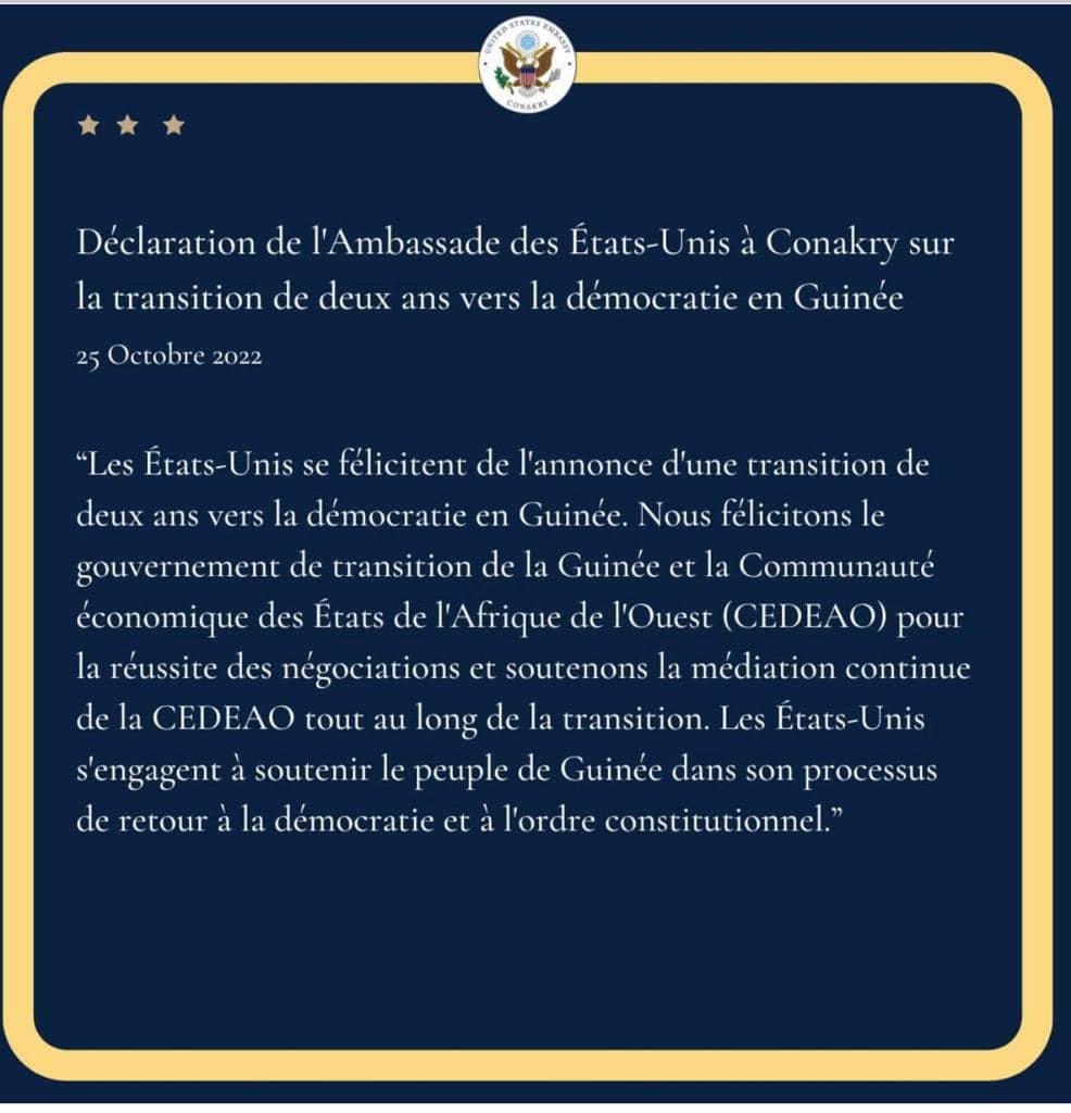 Dans une déclaration sur sa page Facebook, l’ambassade des États-Unis à Conakry a félicité mardi le gouvernement de la transition de la Guinée et la Cedeao pour « la réussite des négociations ».