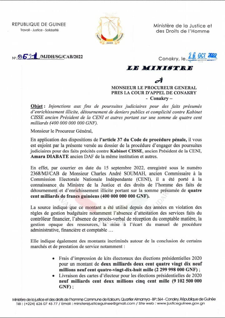 Le ministre de la Justice Alphonse Charles Wright a dans une correspondance adressée mercredi au procureur général près la Cour d’appel de Conakry demandé de poursuivre Kabinet Cissé et Amara Diakité, respectivement ex-president et DAF de la Commission electorale nationale indépendante (Ceni) pour détournement présumé de 400 milliards francs guinéens.