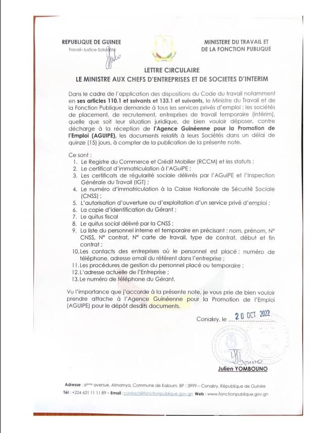 Dans le cadre de l’application des dispositions du Code du travail notamment en ses articles 110.1 et suivants et 133.1 et suivants, le Ministre du Travail et de la Fonction Publique demande à tous les services privés d’emploi : les sociétés de placement, de recrutement, entreprises de travail temporaire (intérim). quelle que soit leur situation juridique, de bien vouloir déposer, contre décharge à la réception de l’Agence Guinéenne pour la Promotion de l’Emploi (AGUIPE), les documents relatifs à leurs Sociétés dans un délai de quinze (15) jours, à compter de la publication de la présente note.