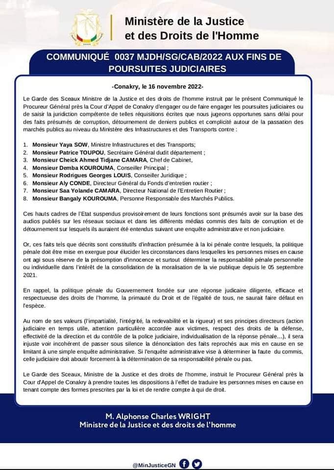 Les ennuis se multiplient et se succèdent pour Yaya Sow désormais ancien ministre des transports et des infrastructures. Seulement quelques minutes après son limogeage avec sept autres cadres de son département, dans un communiqué, le ministre de la Justice et des Droits de l’homme, Alphonse Charles Wright a instruit d’engager des poursuites judiciaires pour des faits présumés de corruption, détournement de deniers publics et complicité autour des passations des marchés au ministère des Infrastructures et des Transports.