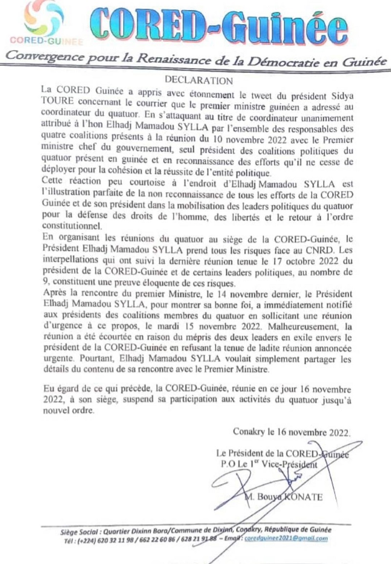 L’article La CORED de Mamadou Sylla, suspend sa participation au sein du quatuor (Raisons) est apparu en premier sur Guinee7.com.