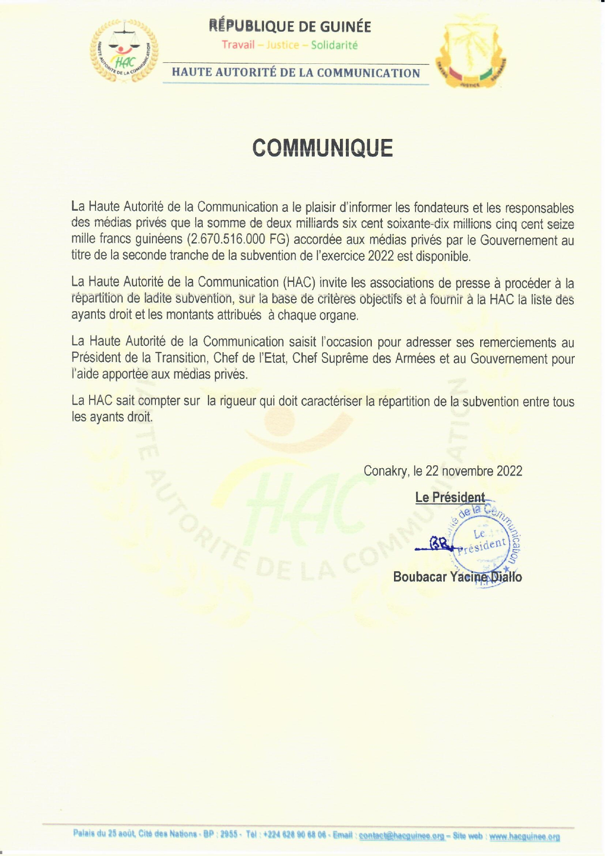 Dans un communiqué, le président de la Haute autorité de la Communication (HAC) Boubacar Yacine Diallo annonce disponible le montant de 2 milliards 670 millions 516 mille francs guinéens au titre de la seconde tranche de la subvention de l’exercice 2022.