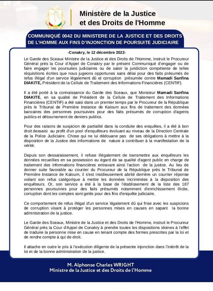 Le ministre de la Justice et des droits de l’homme, Alphonse Charles Wright, a instruit des poursuites judiciaires contre Mamadi Sanfina Diakité, président de la Cellule de Traitement des Informations Financières (CENTIF). Il lui est reproché des faits présumés de « refus illégal d’un service légalement dû et corruption ».