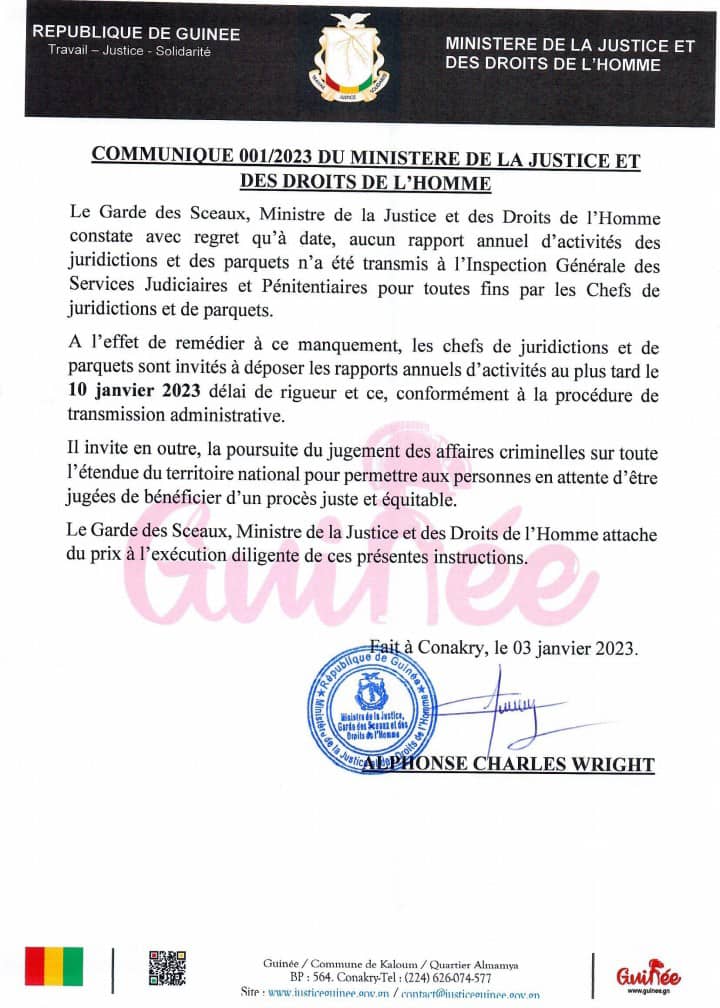 Dans un communiqué publié sur les réseaux sociaux, Alphonse Charles Wright, le ministre de la justice et des droits de l’Homme a regretté le fait qu’aucun « rapport annuel d’activités des juridictions et des parquets n’a été transmis à l’inspection générale des services judiciaires et pénitentiaires ».