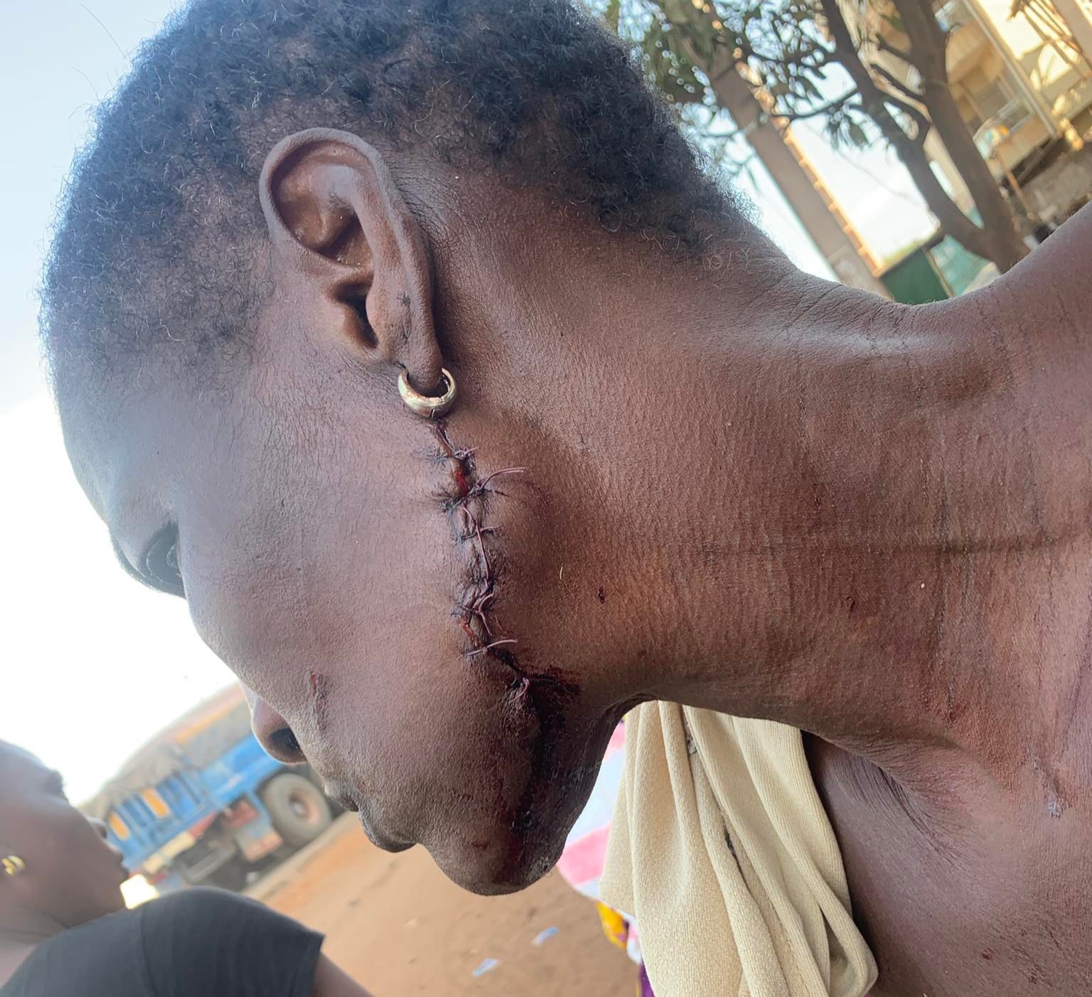 Nous avons rencontré cette dame au bord de la route seule, alors qu’elle sortait d’une clinique privée. Avec des blessures fraîches sur son corps, visibles sur son bras gauche, des points de suture sur le visage, du menton jusqu’au niveau de son oreille, sa chemise en main, le pagne attaché à la poitrine, sans chaussures.