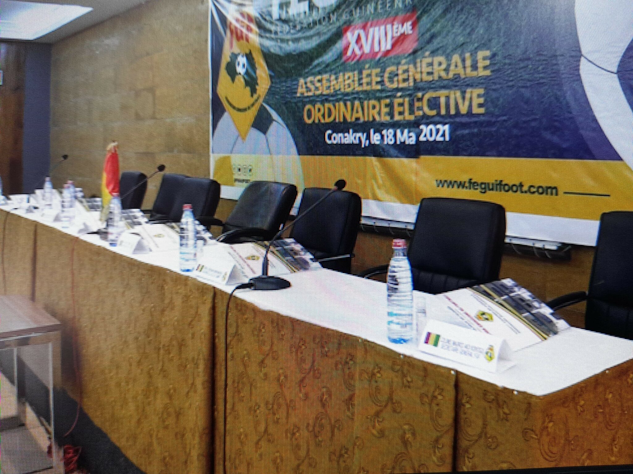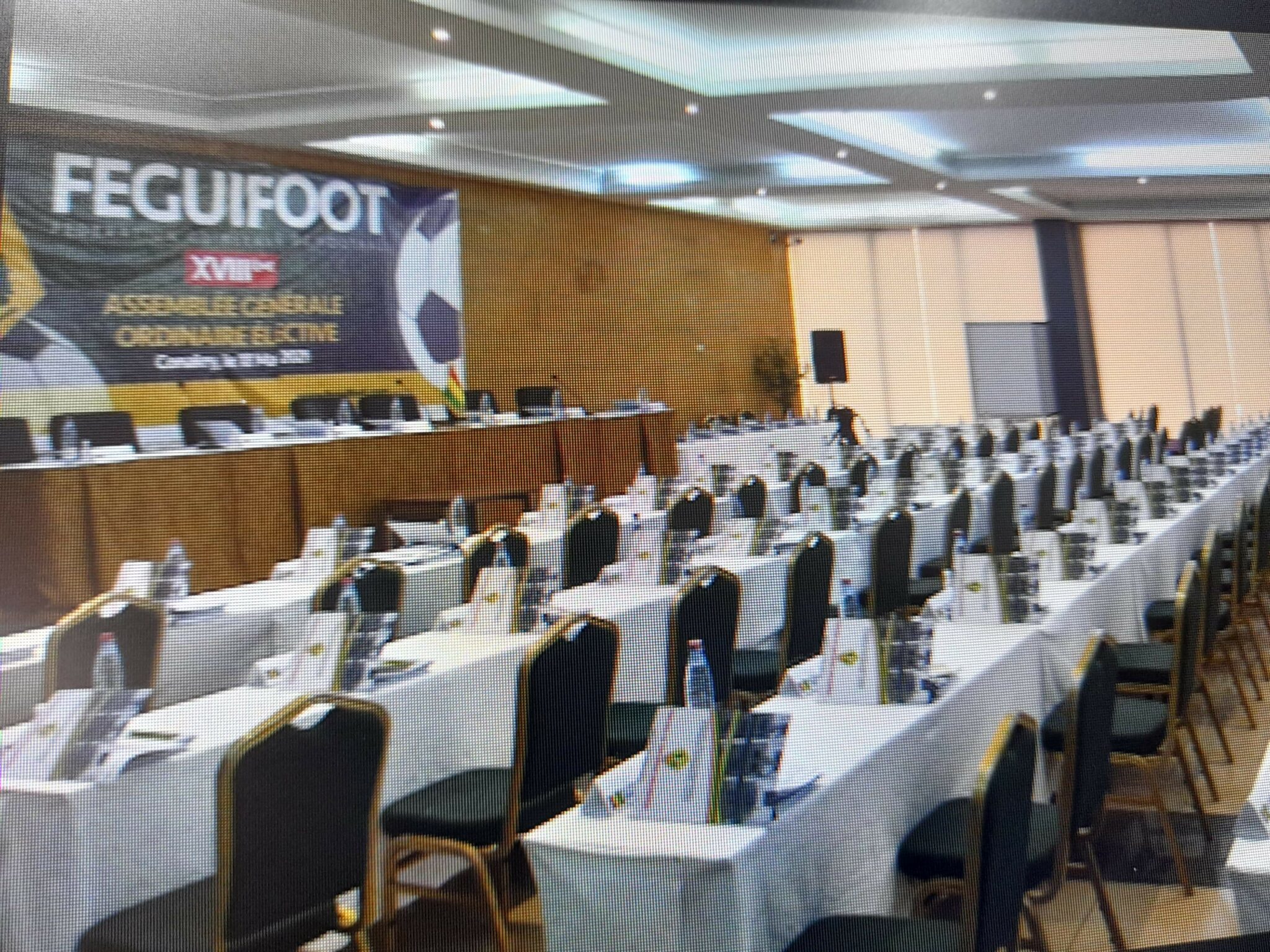 CONAKRY- Les membres statutaires étaient prêts à voter ce mardi 18 mai pour élire un nouveau président de la Fédération Guinéenne de Football. Malheureusement, la FIFA a douché ces membres statutaires en demandant à la commission électorale de surseoir au congrès, car ayant constaté le violations des statuts de la Feguifoot. Tôt ce matin, notre rédaction a fait un tour à l’hôtel qui héberge les votants, et la salle était prête à les recevoir.