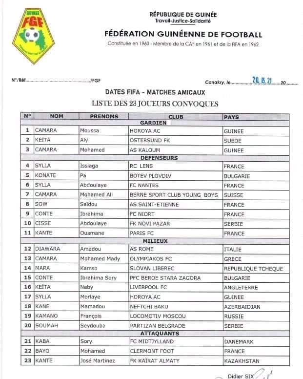 L’attaquant José Martinez Kanté et le défenseur Pa Konaté font leur retour, alors que les habitués Naby Keita, Mady Camara, Issiaga Sylla Kamso Mara et François KAMANO sont bien là. Meilleur buteur de la deuxième division française, Mohamed Bayo figure bien dans cette liste de Didier Six.