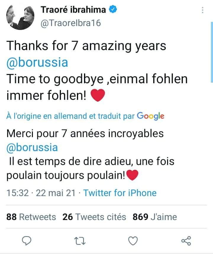 “Merci pour les 7 années incroyables. Il est temps de dire adieu, une fois poulain, toujours poulain ” a Twitté le joueur de 33 ans. Cette saison, Ibrahima TRAORÉ n’a joué que 189 minutes avec Mönchengladbach (2 buts).