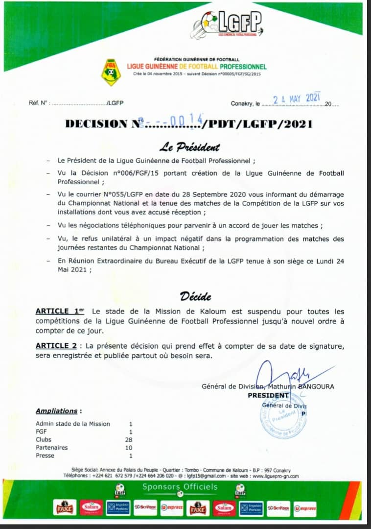 L’article Ligue 2 : la LGFP suspend le stade de la mission, l’ASK contre-attaque est apparu en premier sur Guineefoot.