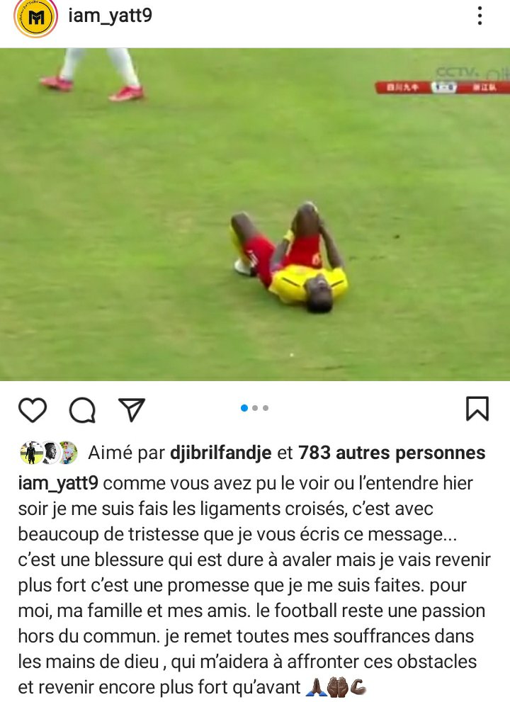 “Comme vous avez pu le voir ou entendre, hier soir je me suis fais les ligaments croisés. C’est avec beaucoup de tristesse que je vous écris ce message. Cest une blessure qui est dure à avaler mais je vais revenir plus fort, c’est une promesse que je me suis faites pour moi, ma famille, et mes amis. Le football reste une passion hors du commun. Je remet toutes mes souffrances dans les mains de Dieu qui m’aidera à affronter ces obstacles et revenir encore plus fort qu’avant”.