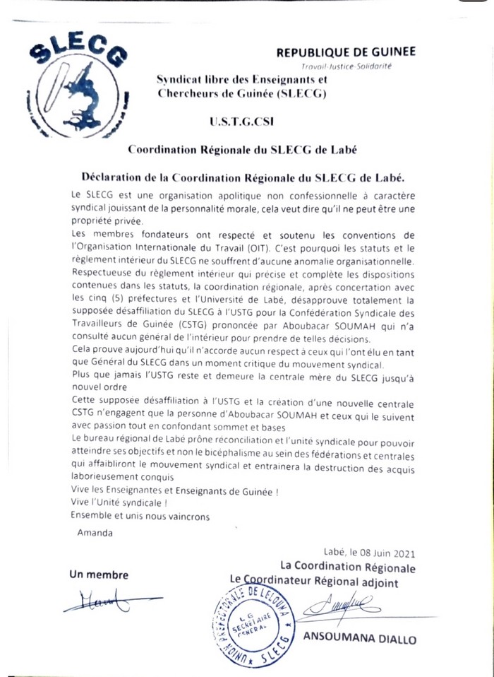 Dans un communiqué rendu public, ce mercredi 9 juin, la coordination régionale du SLECG de Labé a officiellement annoncé son désaccord à la décision d’Aboubacar Soumah de désaffilier le SLECG à l’USTG.