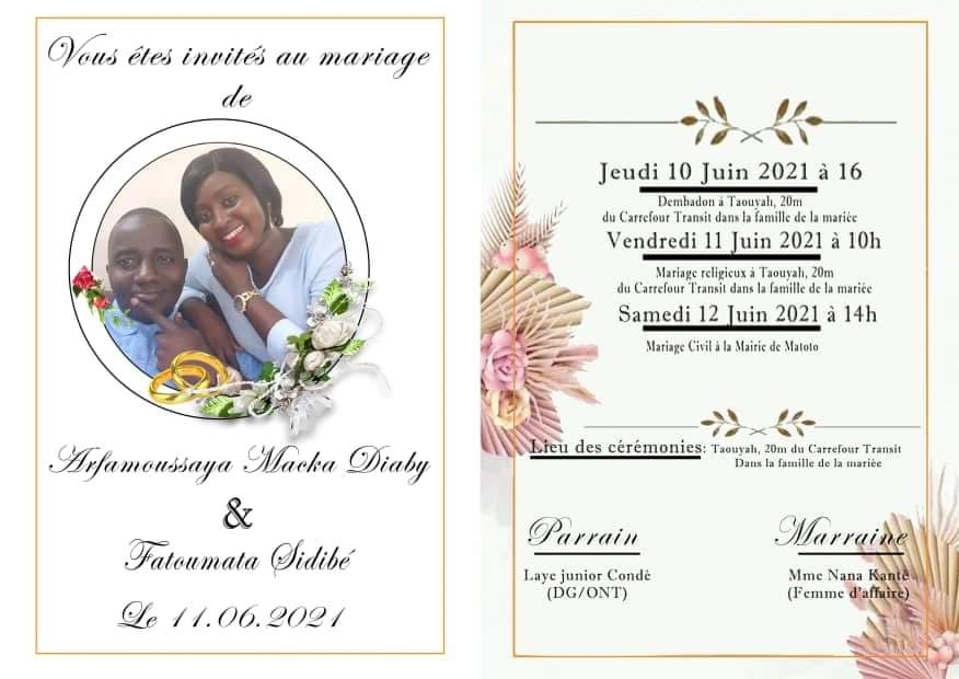 Courtois, bosseur, affable, sentinelle du parti au pouvoir et taquin, le jeune natif de la sous-préfecture de Arfamoussaya a choisi comme parrain l’As de l’ONT Laye Junior Condé. Sa belle et charmante future épouse qui sera dans une robe au style élégant et classique a préféré une battante femme daffaires Nana Kanté comme la marraine.