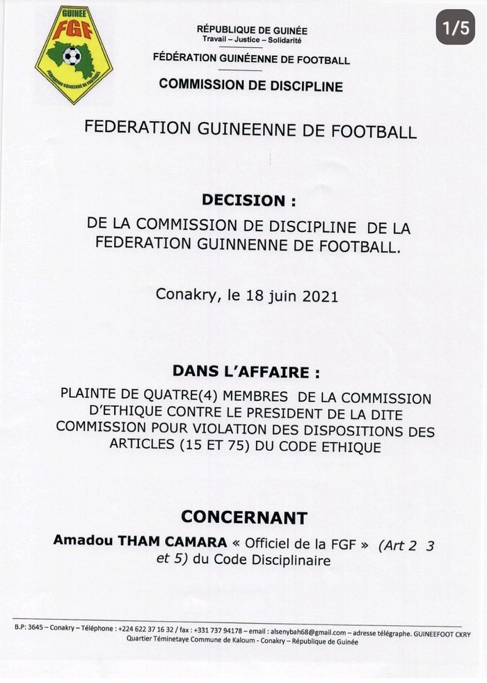 Par conséquent, la commission de discipline interdit à Tham Camara d’exercer “toutes activités liées au football pour les 3 prochaines années. Il devra aussi s’acquitter d’une amende qui s’élève à 5 millions de francs guinéens”.