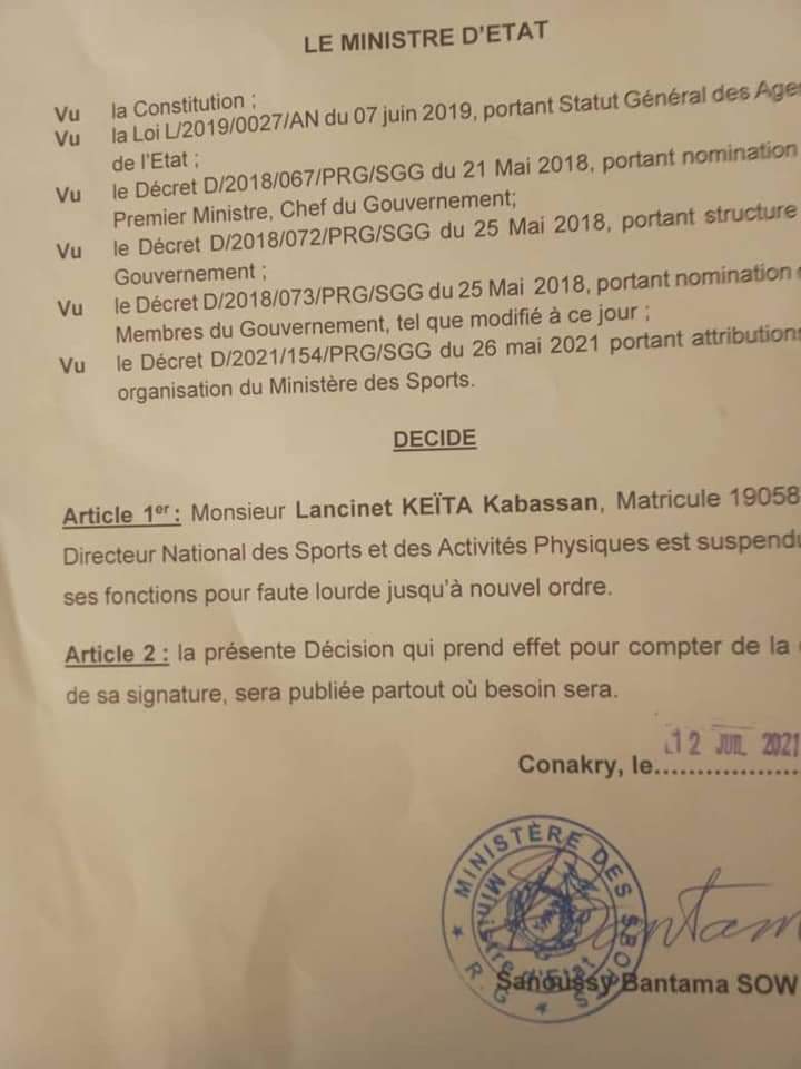 CONAKRY- le directeur national des sports et des activités physiques est suspendu de ses fonctions.
