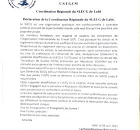 Dans un communiqué rendu public, ce mercredi 9 juin, la coordination régionale du SLECG de Labé a officiellement annoncé son désaccord...